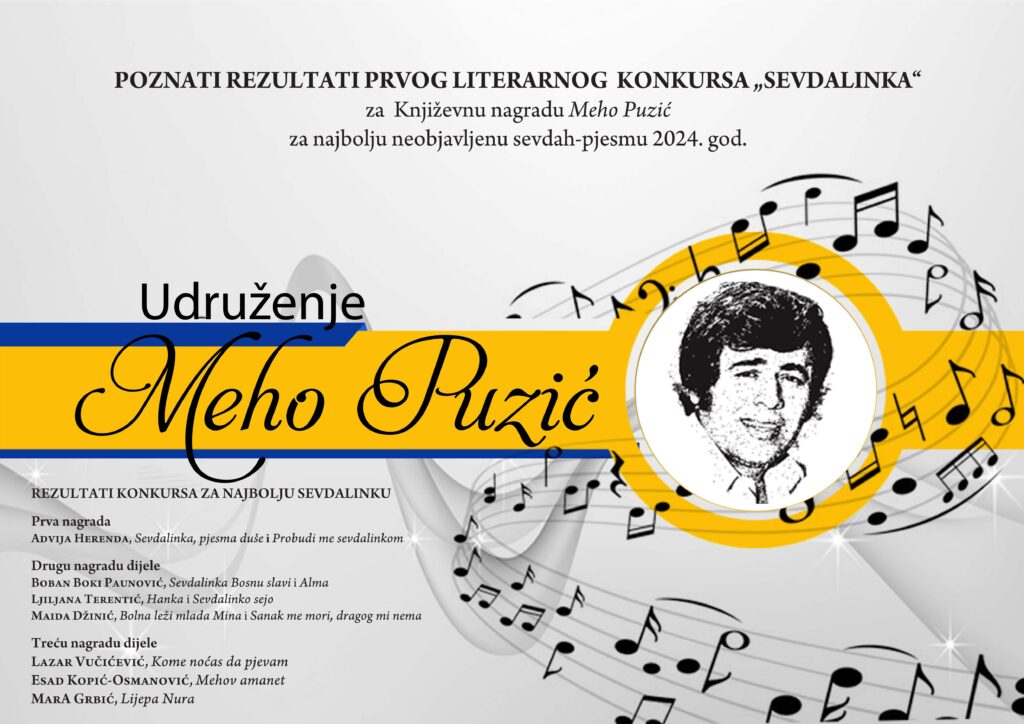 S ponosom objavljujemo rezultate književnog konkursa āSevdalinkaā, posveÄenog legendarnom Mehi PuziÄu ā Äovjeku zlatnog glasa i Äuvaru bosanske pjesme.